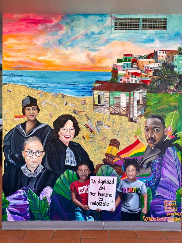 En el mural se encuentra Herminia Tormes Garcia, primera mujer abogada de PR. Sonia Sotomayor, Jueza, abogada, jurista, profesora y politica. Ruth Bader Ginsburg, jueza asociada de la Corte Suprema. Martin Luther King, pastor y activista de los derechos civiles para los afroestadounidenses.